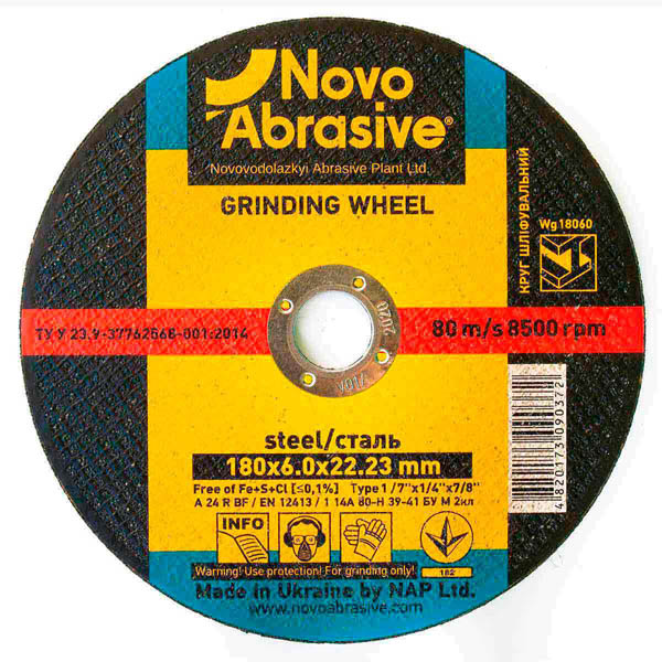Диск шліфувальний по металу NOVO ABRASIVE. Коло для болгарки українського виробництва розміром 180х6х22. Виготовлений з якісного електрокорунду і заснований на бакелітовій зв'язці. Гнучкий і практичний виріб дозволяє легко шліфувати металеву поверхню, не навантажуючи руки. Надійне кріплення сердечника до основи забезпечує безпечне використання диска для болгарки. Інструмент армований потрійним шаром скловолокна, що розширює його робочий ресурс. Використовується в професійному середовищі та в домашніх умовах. Купити шліфувальний диск для болгарки ви можете у нас, на сайті «ЛАЙНЕР». Є можливість безкоштовного вивезення товару, або доставка по всій Україні Новою поштою, Інтаймом, Делівері.