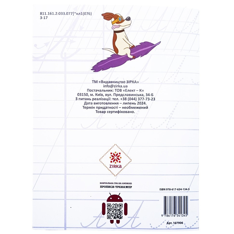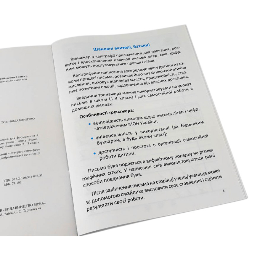 Зошит для навчання, розвитку та вдосконалення навичок каліграфічного написання букв, слів, з'єднань букв у склади і слова, цифр. Буде корисним при навчанні правшів і лівшів в школі і вдома. Універсальний зошит (підходить до будь-якого букварика) відповідає вимогам МОН України з написання букв і цифр, доступний і простий в роботі.