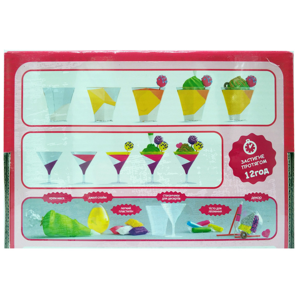 Комплектація: крем-маса - 1 шт, легкий пластилін - 4 шт різних кольорів, тісто для ліплення - 4 шт, слайм - 1 шт, стаканчики для десертів - 2 шт, контейнер для декору - 1 шт, стек - 1 шт, набір наліпок - 1 шт, предмети декору - 5 шт, посипка - 1 шт., інструкція.