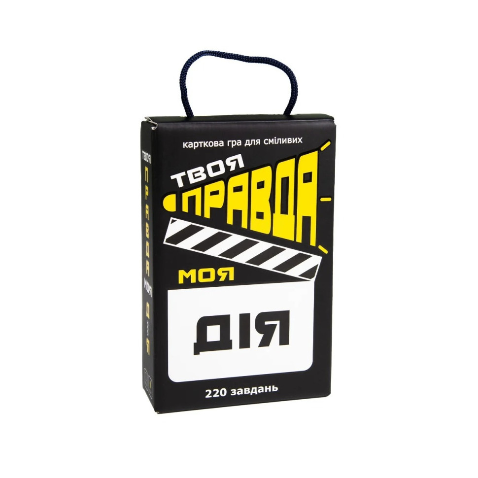 У гру «Твоя правда, моя дія» грають вдвох або великою компанією. Гравці по черзі відповідають на каверзні запитання або виконують різні дії. Можна відмовитися від завдання, але лише двічі за гру, а якщо гравець відмовиться втретє – програє. Не можна також більше двох разів поспіль обирати завдання «Челендж» або «Правда». Виграє той, хто протримається до закінчення колоди карток та буде чесним і сміливим.Гра «Твоя правда, моя дія» Strateg (30233) для тих, хто обирає не боятися казати правду або робити щось шалене.♦ Рекомендований вік гравців: 16+♦ Размір пакування: 12,2х18,2х4,5 см♦ Комплектація гри: 110 карток з картону, паперова інструкція.♦ Вага гри в коробці: 240 г (+-20 г)♦ Кількість гравців: 2-8Гра українською мовою.