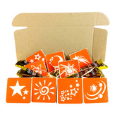 Колекція простих трафаретів мультяшних героїв, 24 штуки в розмірі 6 на 6 см.Як зробити біо-тату:виберіть рівномірну ділянку шкіри;добре знежирте її;зніміть із трафарету білу підкладку (паперова основа трафарету);приклейте трафарет на суху і знежирену шкіру;акуратно зніміть прозору плівку і переконайтеся, що трафарет (помаранчева частина) щільно приклеєний до шкіри;нанесіть рівномірний шар клею для боді-дизайну і дайте йому просохнути (від 30 секунд до 2 хвилин залежно від шару клею);нанесіть гліттер (блискітки) на клей і щільно вбийте його пензлем для гліттера;змахніть надлишки гліттера пензлем-зміткою і зніміть трафарет.Для чого потрібен трафарет:якщо не вмієте малювати від руки;якщо потрібно багато і швидко малювати;потрібно створювати однакові і за розміром, і за зовнішнім виглядом малюнки - скористайтеся трафаретами Fresh Tattoo;трафарети Fresh Tattoo безпечні для шкіри та підходять для нанесення тимчасових тату всіх типів: гліттер-тату, хною, оксамитом, пігментом, джагуа-гелем тощо;підходять для хімічного або піскоструминного матування виробів зі скла (чашки, келихи, дзеркала)