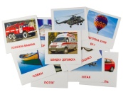 Картонні картки, на кожній з карток зображено різний транспорт і його назви.