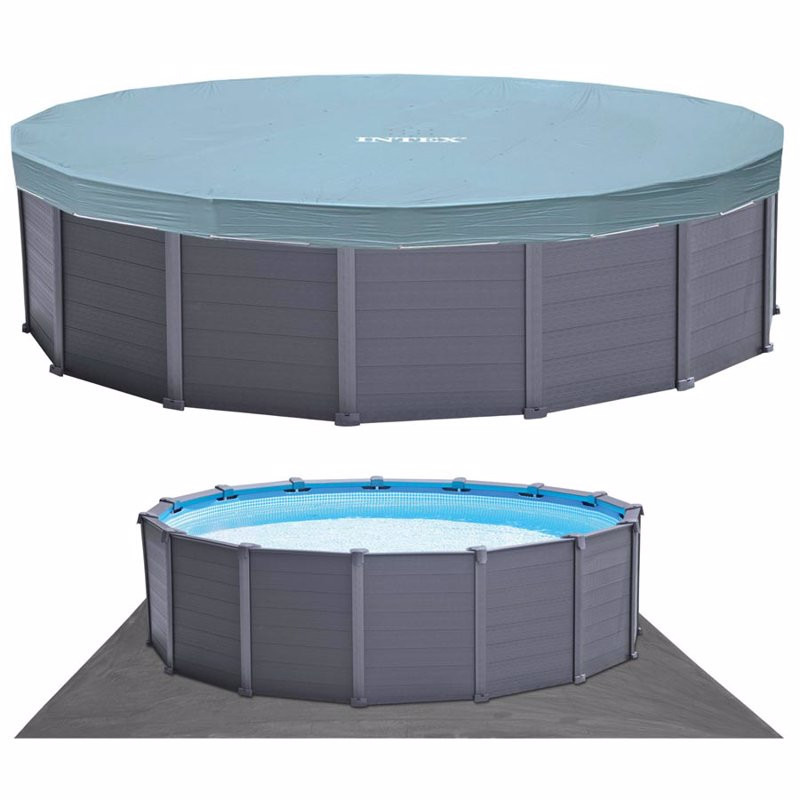 Характеристика на басейн Intex 26384 :Фактичний діаметр - 457 смВисота басейну - 122 смМакс. обсяг басейну - 16805 л.Виробник - IntexКолір - графітовийФорма басейну - круглаМатеріал - тришаровий ПВХ: два шару ПВХ і шар скло-волоконної сіткиКаркас - оцинковані сталеві трубиОблицювання - пластик (зроблений під графіт)Комплектація басейну Intex 28384 Graphite:*Пісочний насос - продуктивність 4500 л/год, необхідну кількість кварцового піску 12 кг.*Сходи - 132 см зі знімними ступенями і майданчиком*Підстилка з тентом - є.Упаковка - картонна коробка : 131 х 83,5 х 98,7 смВага 228 кг