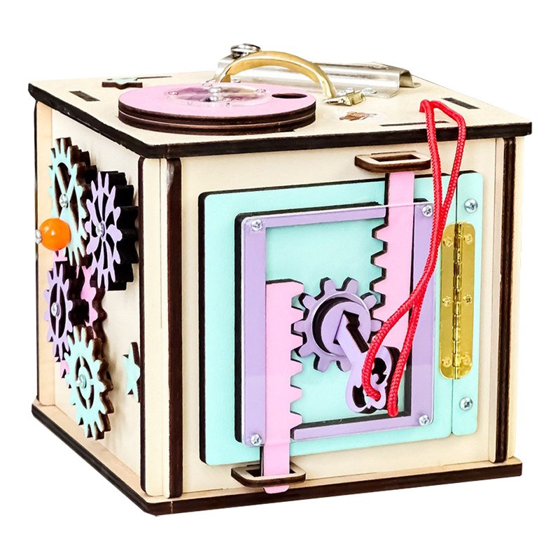 Представляємо вам яскраву новинку від бренду дитячих іграшок. Цей барвистий бизикуб розміром 15 * 15 не тільки забавляє дитину, але і розвиває дитину через природні інтереси і діяльність, а не через використання формальних методик навчання. Бізікубік має компактні розміри, тому не займає багато місця в будинку. Його також можна брати з собою в дорогу: так дитина точно не занудьгує в автомобілі. Незважаючи на свої досить маленькі розміри, бізікуб має безліч ігрових елементів: Сортер з геометричними фігурами для розвитку сприйняття кольору і форми; Музична скринька і три шестерінки з бісером-ці елементи познайомлять дитину з простими механізмами, і поліпшать слухове сприйняття; Предмети одягу: липучка, Застібка-блискавка, і яскрава шнурівка, де дитина навчиться зав'язувати бантики і шнурувати; Віконце на замочку, де захована собачка; Лабіринт-водилка для зміцнення пальчиків і кистей рук; Намистинки, які можна рухати, - для поліпшення захоплення пальчиків; Годинник з рухомими дерев'яними стрілками; Обертовий барабан з цифрами і різними малюнками для того, щоб вчити дитину рахувати.
