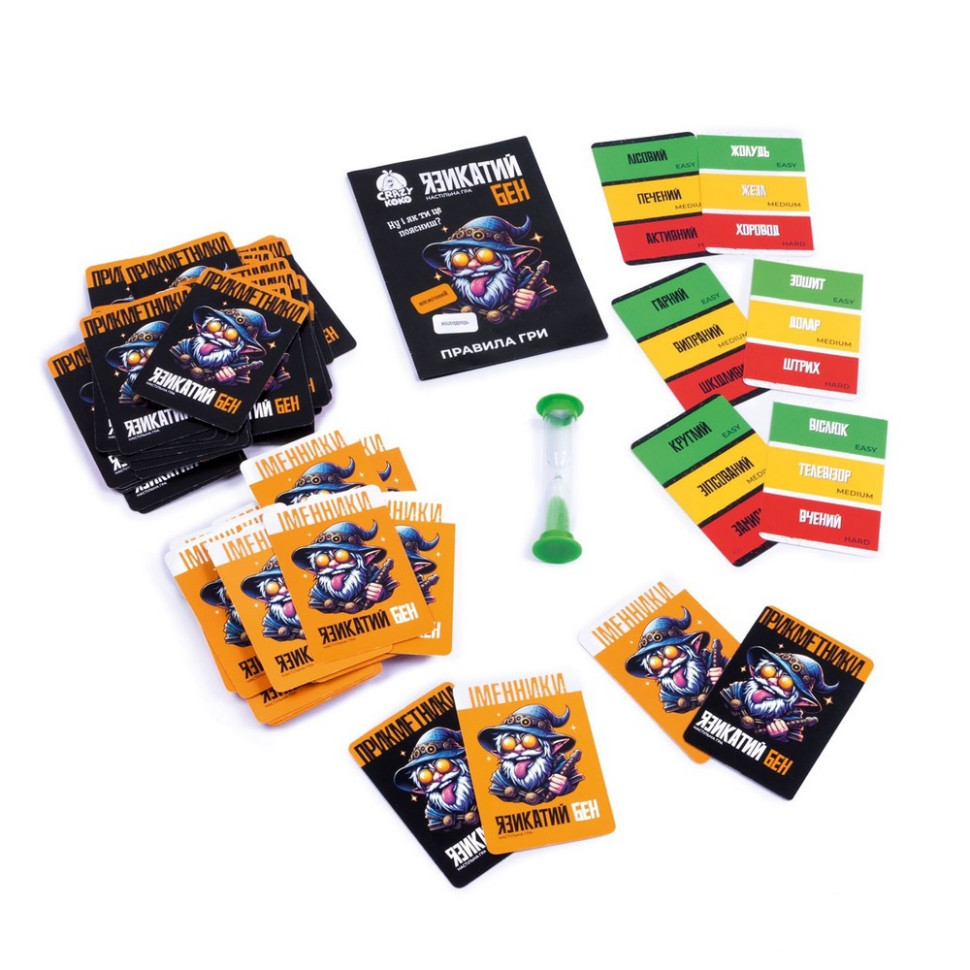 Плануєте весело провести час з компанією? Гра настільна Vladi Toys розважальна “Язикатий Бен” стане в нагоді для гри на вечірці або веселих дружніх посиденьках. Складніше рівень, гучніше регіт!Маємо дві колоди карток. На одній колоді написані іменники, на другій колоді - прикметники. Тягніть по картці з кожної колоди і об’єднуйте іменник з прикметником згідно обраного рівня складності. Вийшло дивно, абсурдно, неочікуванно?А тепер спробуйте пояснити отримані дотепні словосполучення партнеру по команді. Раунд почався! І щоб було цікавіше, намагайтесь пояснити за 30 секунд! Час раунду контролюватиме пісочний годинник.Настільна гра "Язикатий Бен" має 4 рівня складності: простий, середній, важкий і повний хаос! Грайте і збільшуйте рівень складності словосполучень і рівень сміху.Кількість гравців: 4-12.Тривалість гри: 30-40 хвилин.Комплектація: 100 карток (2 колоди по 50 карт), пісочний годинник, правила гри.Вік: 14-99 років.