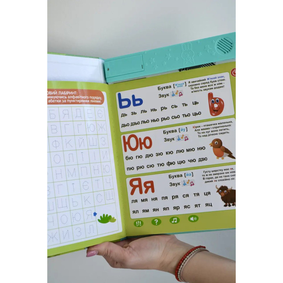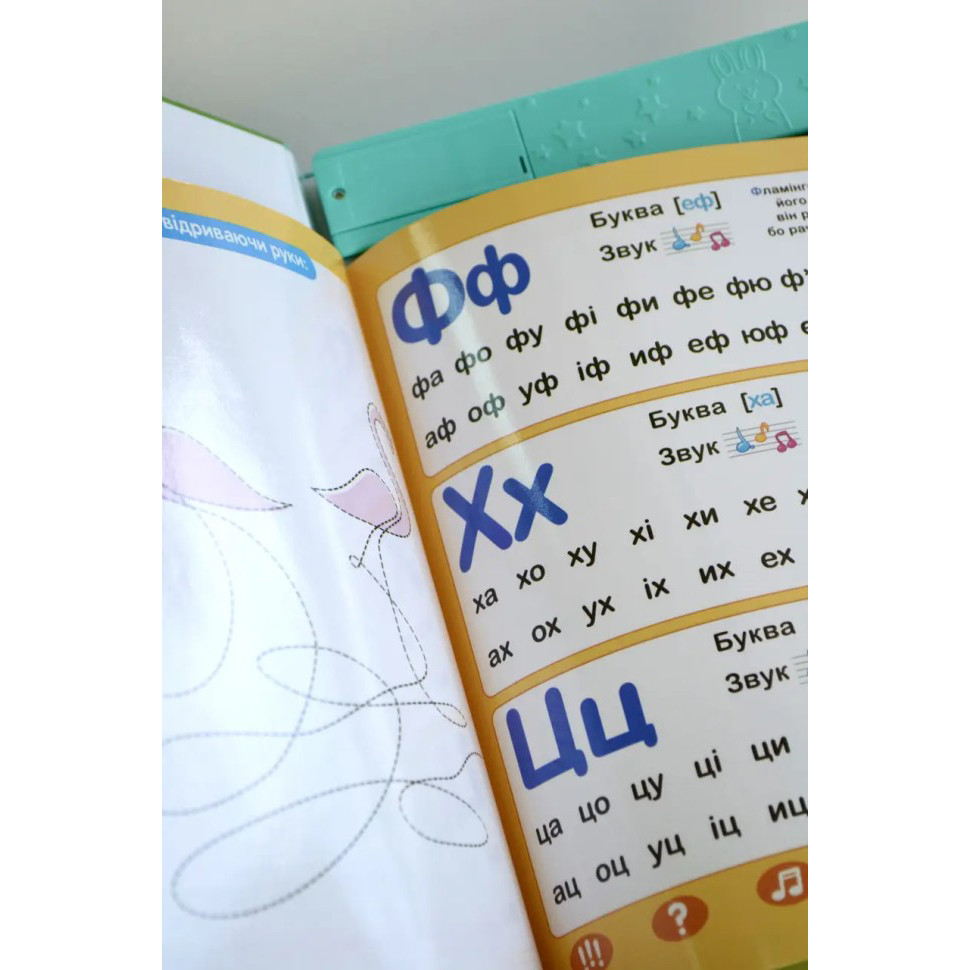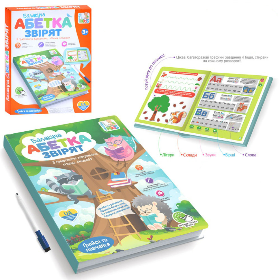 Турботливі батьки обирають для розвитку дитини розвивальні іграшки. Саме інтерактивна книга стане вірним супутником у навчанні та пізнанні навколишнього світу.Особливості моделі:яскраві малюнки;букви, звуки, слова, склади, вірші українською мовою;пісні про абетку;графічні завдання на кожному розвороті (пиши, стрірай);гра «знайди букву, слово»;регулювання гучності;маркер для малювання.Працює від 3-х батарейок ААА (до комплекту не входять).