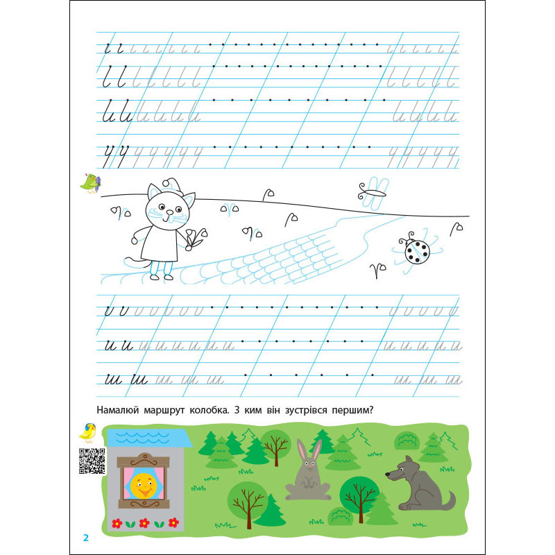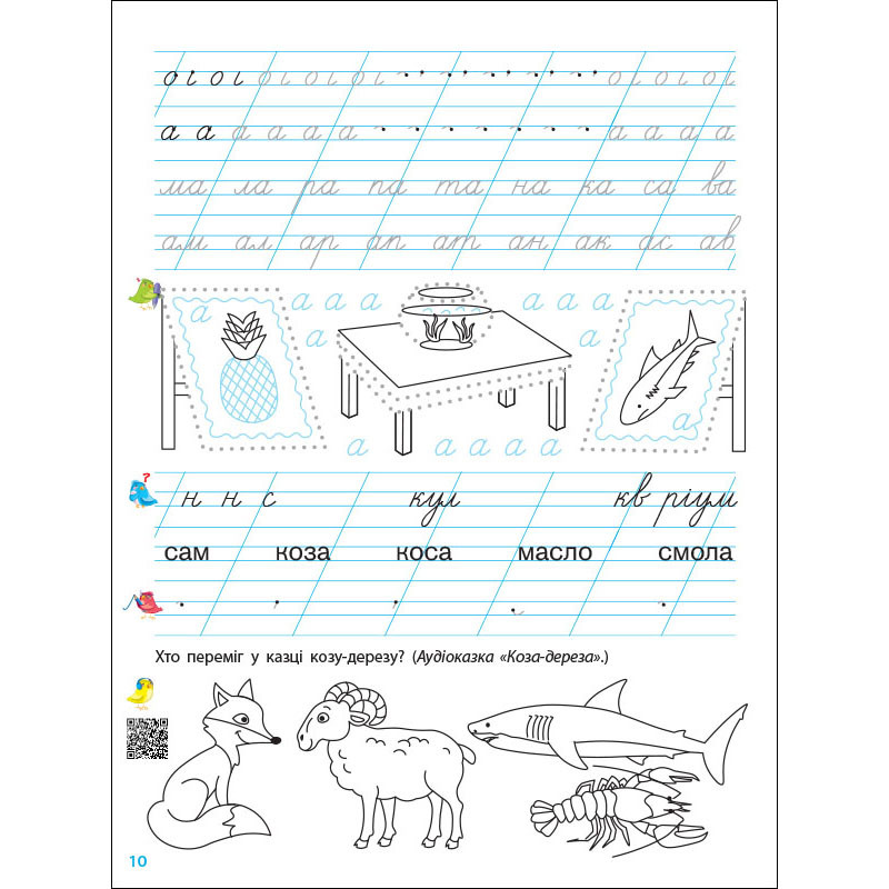 Вчимося писати правильно. Пишемо літери, прописуємо з'єднання, пишемо слова з різними видами з'єднань, списуємо слова та речення. Виконуємо мовні вправи. А також тренувальні вправи на штрихування, обведення, забарвлення. Аудіоказки та ігрові завдання для кожної казки.Кількість сторінок 32