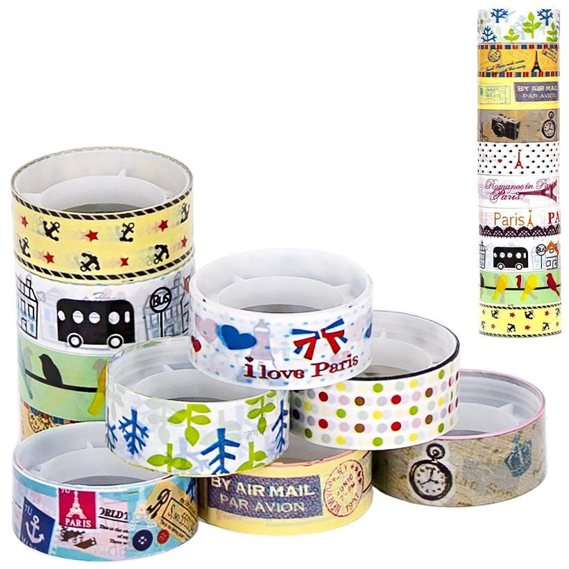 Набір з 10 рулонів декоративного скотча з малюнками. Кожен рулон має розміри 1,5 см на 2 м. Скотч виготовлений з ПВХ. Підходить для вклеювання фотографій, декорування книг, кімнат або упаковки подарунків.