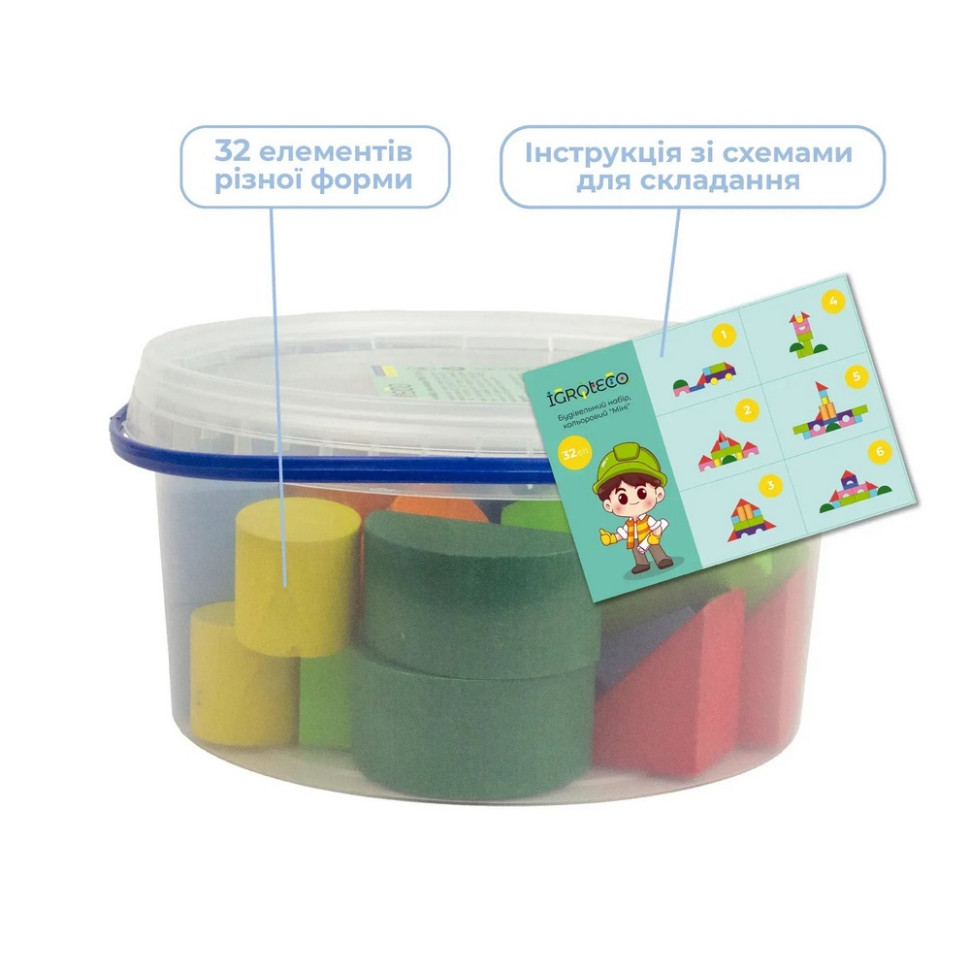 Будівельний набір, кольоровий “Міні” 32 ел.Яскравий, веселий і компактний – саме таким є кольоровий будівельний набір “Міні” ?. У відеречку на дитину чекає 32 деталі різних форм: квадрати ?, прямокутники ⬛️, циліндрики ?, конуси ? та місточки ?. Усі вони пофарбовані у безпечні яскраві кольори, які допомагають вивчати відтінки та розвивають сприйняття.Малюк може будувати за інструкцією з прикладами або вигадувати власні казкові споруди – від веселих хатинок до цілих містечок. Це розвивальна дерев’яна іграшка, яка поєднує навчання та гру.✨ Що розвиває гра?✅ знання кольорів і форм✅ логіку та просторове мислення✅ креативність і фантазію✅ рівновагу та вміння конструюватиКомпактний розмір і зручне відеречко роблять цей набір ідеальним для прогулянок і подорожей ✈️. Якщо ви шукаєте дерев’яні іграшки для дітей, які поєднують гру та навчання, цей екологічний конструктор з дерева стане чудовим вибором.