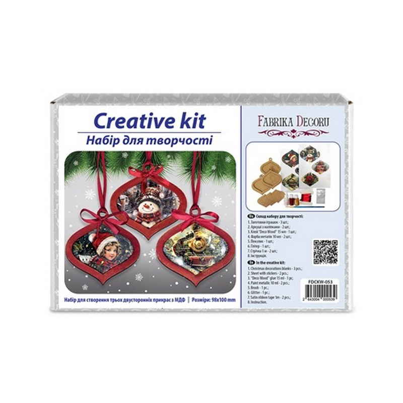Творчий набір «Vintage Christmas» для створення трьох двосторонніх ялинкових прикрас.Набір включає все необхідне для створення ялинкових прикрас: заготовки з щільного ХДФ товщиною 3 мм, казкові зимові зображення, стрічки, блискітки, фарба, клей і пензлик. Вироби прості в роботі і підходять як для початківців, так і для досвідчених майстрів. Наші творчі набори - це чудовий спосіб не тільки заощадити гроші, але і весело провести час з дітьми, при цьому готові прикраси стануть прекрасним оформленням для будь-якої ялинки.Особливості:Габаритні розміри (ШхГхВ): 98 мм х 9 мм х 100 мм.Матеріал: ХДФ товщиною 3 мм.Не містить шкідливих речовин.Берегти від вогню і вологи.Інструкція по створенню новорічних прикрас:1. Дістаньте серединки з основи кожної заготовки.2. Пофарбуйте обідок. Нанесіть фарбу в два шари і дайте їй добре просохнути.3. Приклейте наклейки із зображеннями рівно по центру заготовок.4. З'єднайте і склейте всі частини так, як показано у відеоінструкції.5. Щоб надати виробам ефект інею, нанесіть трохи клею на деякі частини наклейок і посипте глітером. Обережно розподіліть глітер поверх клею.7. Залиште вироби на деякий час, щоб вони повністю висохли.8. З стрічки зробіть бантики і приклейте їх до виробів.9. Другу стрічку розріжте на три частини і вставте в отвори, щоб прикраси можна було підвісити.Примітка: Виймайте деталі з пластин обережно, підрізаючи їх в місцях кріплення по контуру.Зберігати в недоступному для дітей місці, містить дрібні деталі.