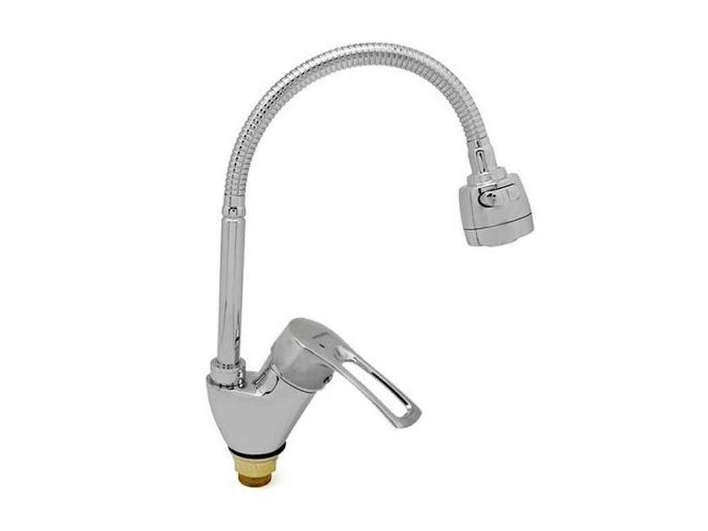 Змішувач для кухні з високим рефлекторним гусаком. Низький корпус. Кріплення на гайці. Додаткові характеристики: комплектується підводкою для змішувача 45 див., кріплення - гайка.