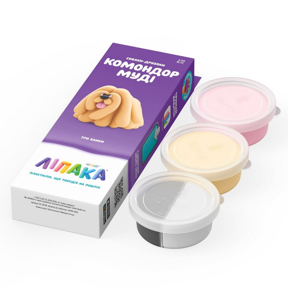 Набір пластиліну, що самостійно твердіє, ЛІПАКА – СОБАКИ-ДРУЗЯКИ: КОМОНДОР МУДІ – розважить і малюків, і дорослих. За допомогою анімаційних інструкцій в додатку HEY CLAY, Ви зможете зліпити собаку. А завдяки компактним розмірам, набір зручно брати з собою. Пластилін твердіє на повітрі протягом 24 годин, після чого можна гратися створеними фігурками.До набору входить 3 баночки пластиліну різного кольору.В набір може входити до 4 різних кольорів (баночка може містити пластилін двох різних кольорів).Розімніть пластилін перед ліпкою!З пластиліну, що входить до набору, можна створити 1 героя, зображеного на упаковці та описаного в інструкції (додатку).У кожному наборі Ви знайдете код для доступу до відповідних героїв у додатку ЛІПАКА HEY CLAY з анімаційними інструкціями.Пластилін ЛІПАКА – це не просто набори пластиліну. Це інтерактивні розвиваючі набори з кодом доступу до додатку ЛІПАКА HEY CLAY, що в ігровій формі навчить малюків ліпити улюблених героїв. HEY CLAY – це унікальний додаток, з інтуїтивно-зрозумілим інтерфейсом, кумедною пластиліновою анімацією та інструкціями для малюків. Починаючи з простих форм та рухів, дитина з легкістю створить обраного героя, освоїть основні прийоми та техніки ліплення. Що, своєю чергою, сприятиме розвитку креативності та спонукатиме до створення власних шедеврів!Пластилін ЛІПАКА – це більш ніж просто ліплення! Разом з пластиліном ЛІПАКА малюки розвивають дрібну моторику, вчаться концентрувати увагу, розвивають креативність та кругозір.Пластилін абсолютно безпечний для дітей, має приємну щільну структуру, не липне до рук, не має запаху та не залишає плям. Крім того, пластилін ЛІПАКА самостійно твердіє на повітрі протягом 24 годин, що дозволяє гратися створеними фігурками.Рекомендовано для дітей від 3 років.