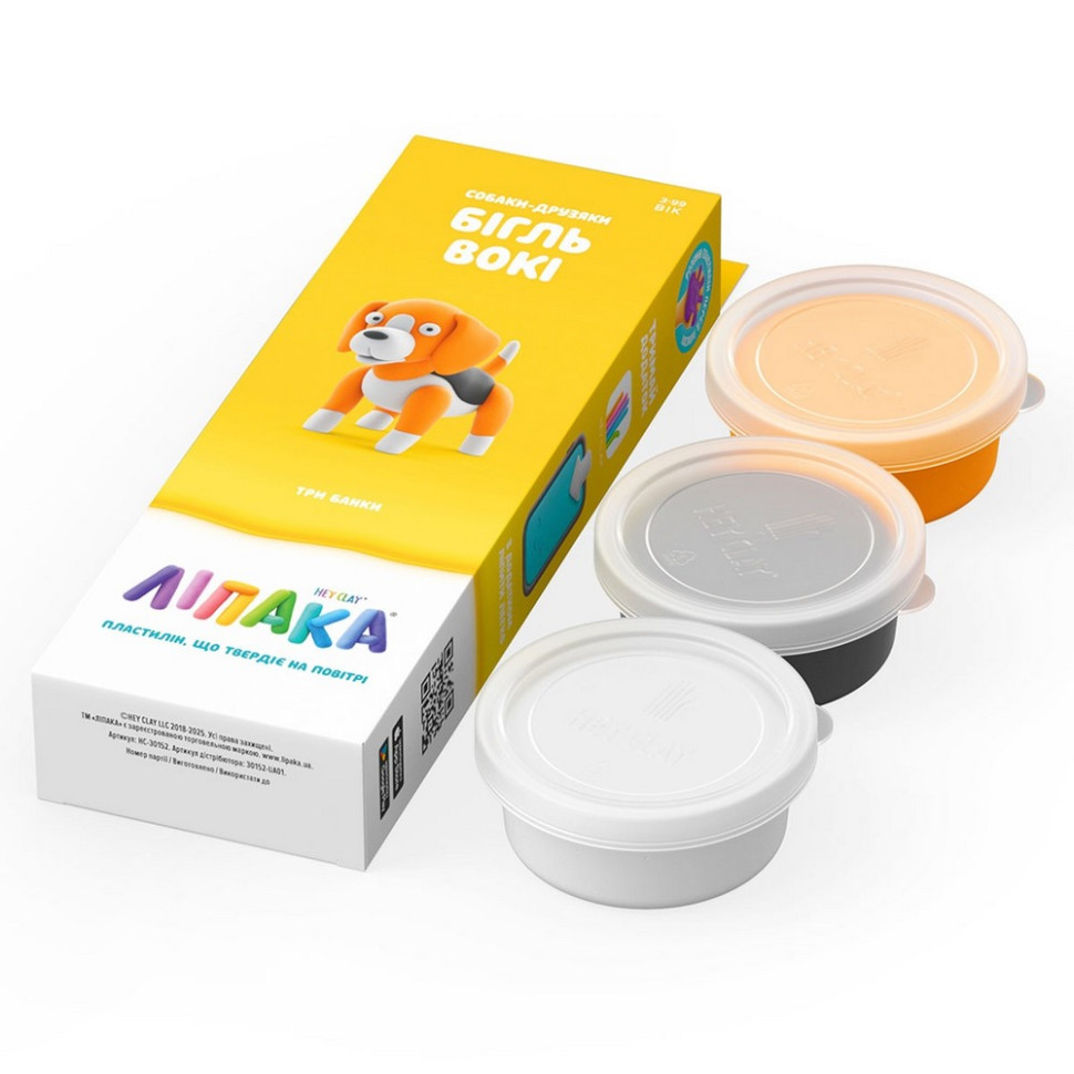 Набір пластиліну, що самостійно твердіє, ЛІПАКА – СОБАКИ-ДРУЗЯКИ: БІГЛЬ ВОКІ – розважить і малюків, і дорослих. За допомогою анімаційних інструкцій в додатку HEY CLAY, Ви зможете зліпити собаку. А завдяки компактним розмірам, набір зручно брати з собою. Пластилін твердіє на повітрі протягом 24 годин, після чого можна гратися створеними фігурками.До набору входить 3 баночки пластиліну різного кольору.В набір може входити до 3 різних кольорів (баночка може містити пластилін двох різних кольорів).Розімніть пластилін перед ліпкою!З пластиліну, що входить до набору, можна створити 1 героя, зображеного на упаковці та описаного в інструкції (додатку).У кожному наборі Ви знайдете код для доступу до відповідних героїв у додатку ЛІПАКА HEY CLAY з анімаційними інструкціями.Пластилін ЛІПАКА – це не просто набори пластиліну. Це інтерактивні розвиваючі набори з кодом доступу до додатку ЛІПАКА HEY CLAY, що в ігровій формі навчить малюків ліпити улюблених героїв. HEY CLAY – це унікальний додаток, з інтуїтивно-зрозумілим інтерфейсом, кумедною пластиліновою анімацією та інструкціями для малюків. Починаючи з простих форм та рухів, дитина з легкістю створить обраного героя, освоїть основні прийоми та техніки ліплення. Що, своєю чергою, сприятиме розвитку креативності та спонукатиме до створення власних шедеврів!Пластилін ЛІПАКА – це більш ніж просто ліплення! Разом з пластиліном ЛІПАКА малюки розвивають дрібну моторику, вчаться концентрувати увагу, розвивають креативність та кругозір.Пластилін абсолютно безпечний для дітей, має приємну щільну структуру, не липне до рук, не має запаху та не залишає плям. Крім того, пластилін ЛІПАКА самостійно твердіє на повітрі протягом 24 годин, що дозволяє гратися створеними фігурками.Рекомендовано для дітей від 3 років.