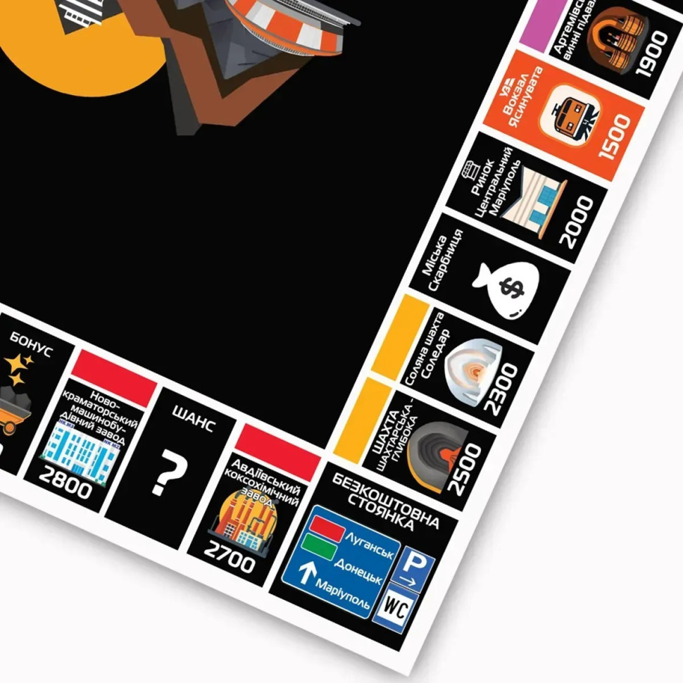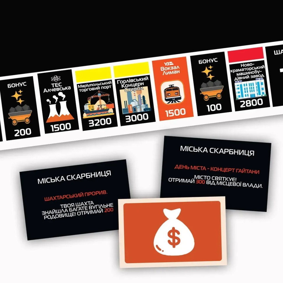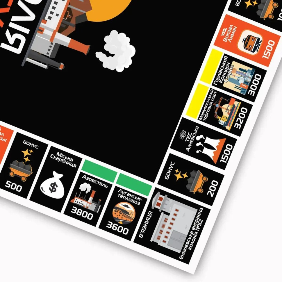 Монополія Донбасу – це не просто гра, а подорож у край дитячих спогадів, шахтарських містечок і знайомих вулиць. Купуйте улюблені місця, відроджуйте заводи та шахти, будуйте своє майбутнє на рідній землі. Відчуйте дух Донбасу – його працю, традиції та незламний характер. Тут кожен хід – це крок до відновлення та збереження пам’яті про рідний край. Для кого ця гра?Відмінно підійде для друзів, сім’ї, тімбілдінга, анти кафе та інших розважальних закладівМонополія Донбасу включає в себе:– ігрове поле– карти документ власності– карти шанс– карти скарбниця– ігрові гроші– кубики і фішки– стікери філій– правила гриКількість гравців: від 2 до 5 осібЧас гри: 45 хв – 2 год