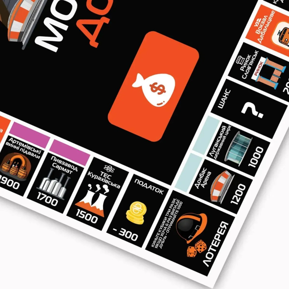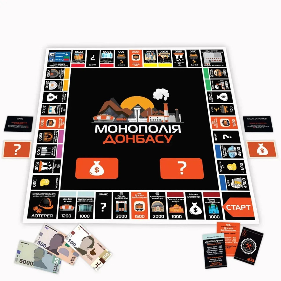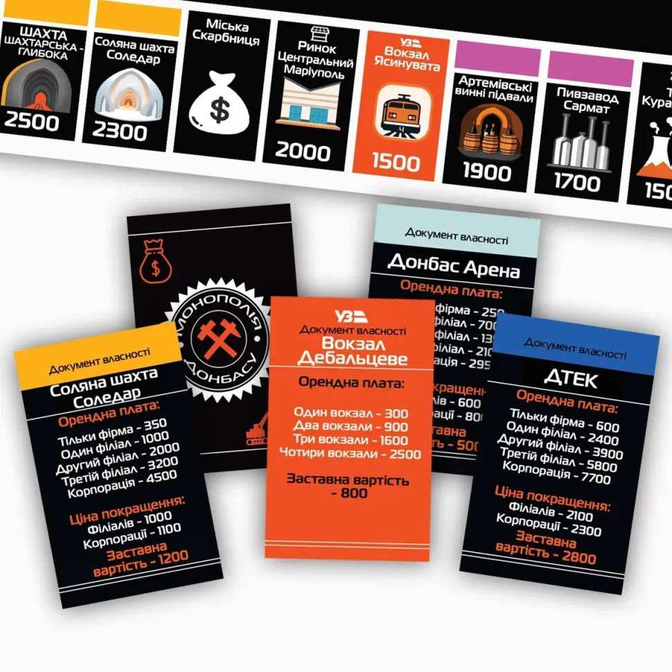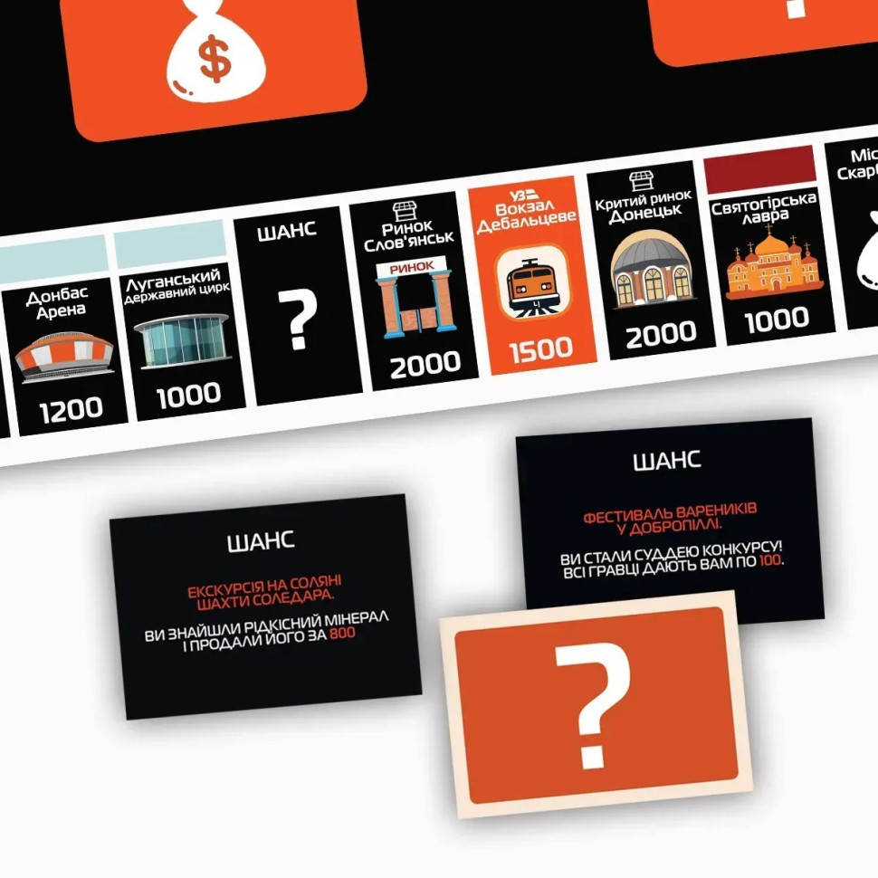 Монополія Донбасу – це не просто гра, а подорож у край дитячих спогадів, шахтарських містечок і знайомих вулиць. Купуйте улюблені місця, відроджуйте заводи та шахти, будуйте своє майбутнє на рідній землі. Відчуйте дух Донбасу – його працю, традиції та незламний характер. Тут кожен хід – це крок до відновлення та збереження пам’яті про рідний край. Для кого ця гра?Відмінно підійде для друзів, сім’ї, тімбілдінга, анти кафе та інших розважальних закладівМонополія Донбасу включає в себе:– ігрове поле– карти документ власності– карти шанс– карти скарбниця– ігрові гроші– кубики і фішки– стікери філій– правила гриКількість гравців: від 2 до 5 осібЧас гри: 45 хв – 2 год