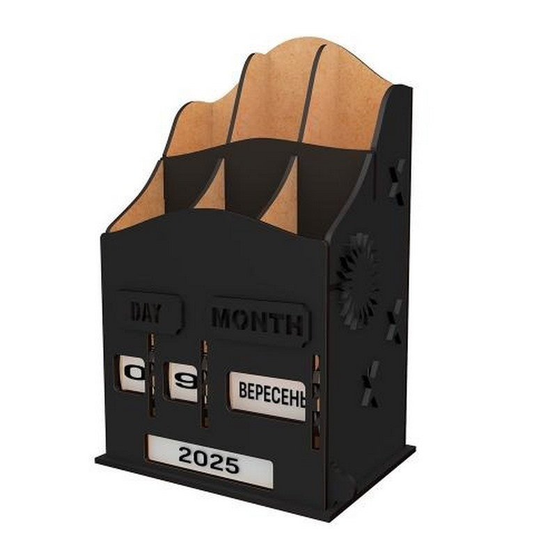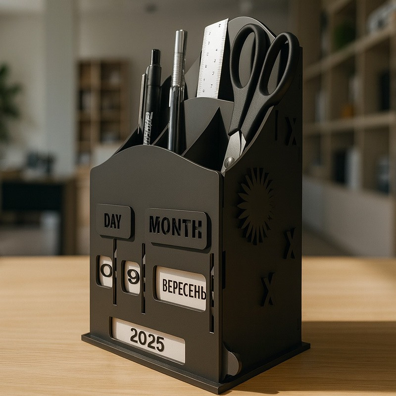 Це не просто органайзер для ручок і канцтоварів. Стильний, з вінтажною ноткою вічний календар від Fabrika Decoru, який стане справжньою окрасою вашого столу. Він послужить і функціональним аксесуаром, і оригінальним подарунком для близьких. Забудьте про набридлі кубики! Унікальний механізм на коліщатках дозволяє встановлювати дату — день, місяць і рік — простим обертанням. Керувати часом ще ніколи не було так просто!