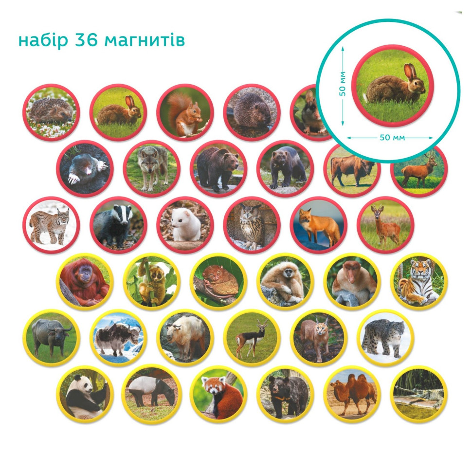 36 магнітів із зображеннями реальних тварин Євразії.