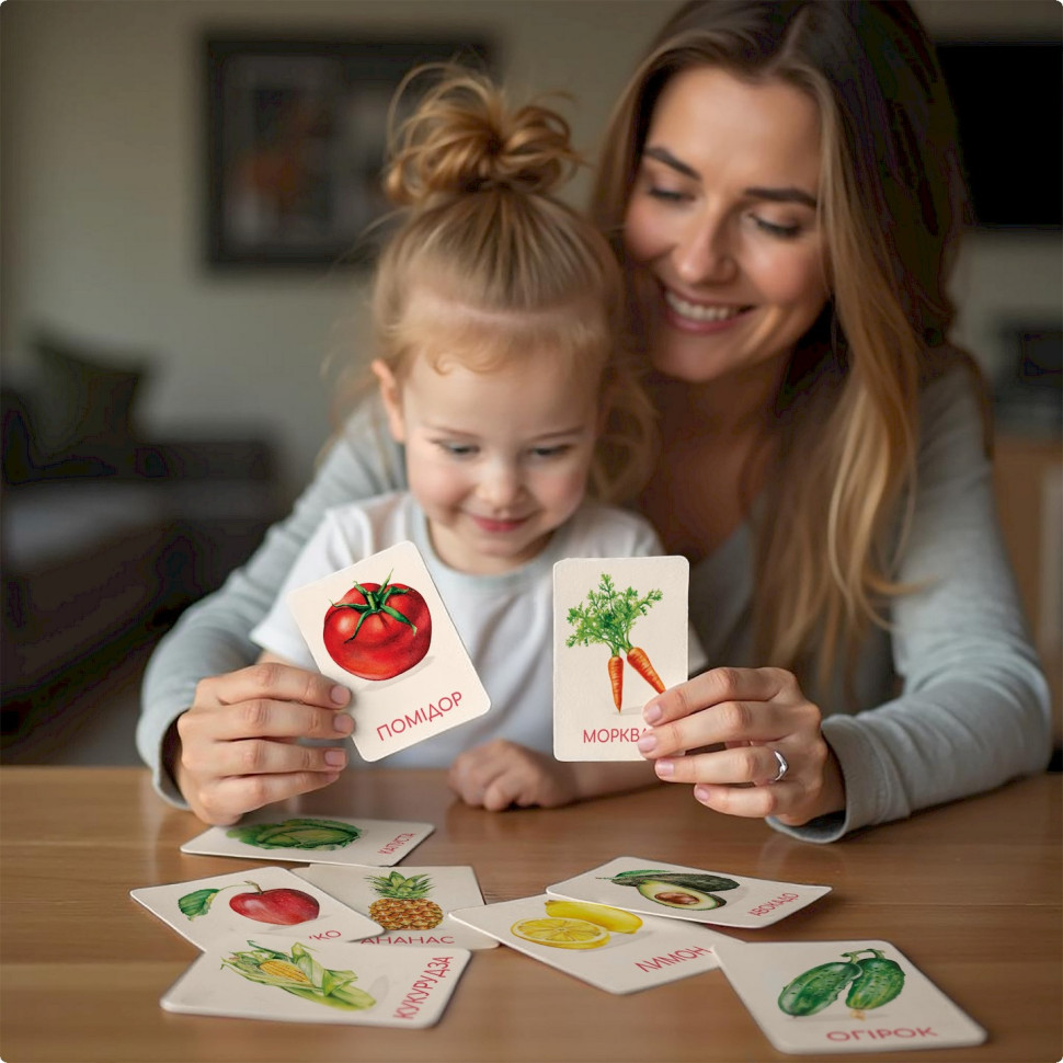 Серія карток з ілюстраціями овочів, фруктів та ягід — кожна карточка відображає природний вигляд продукту.