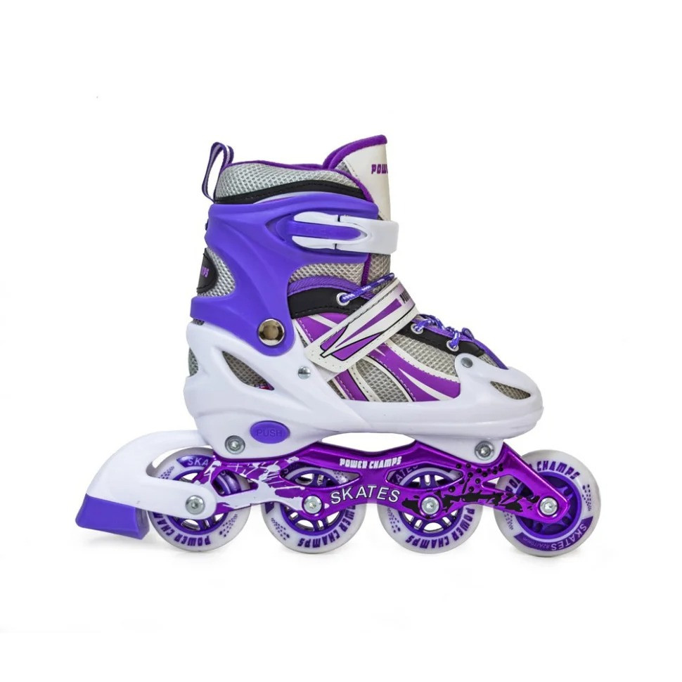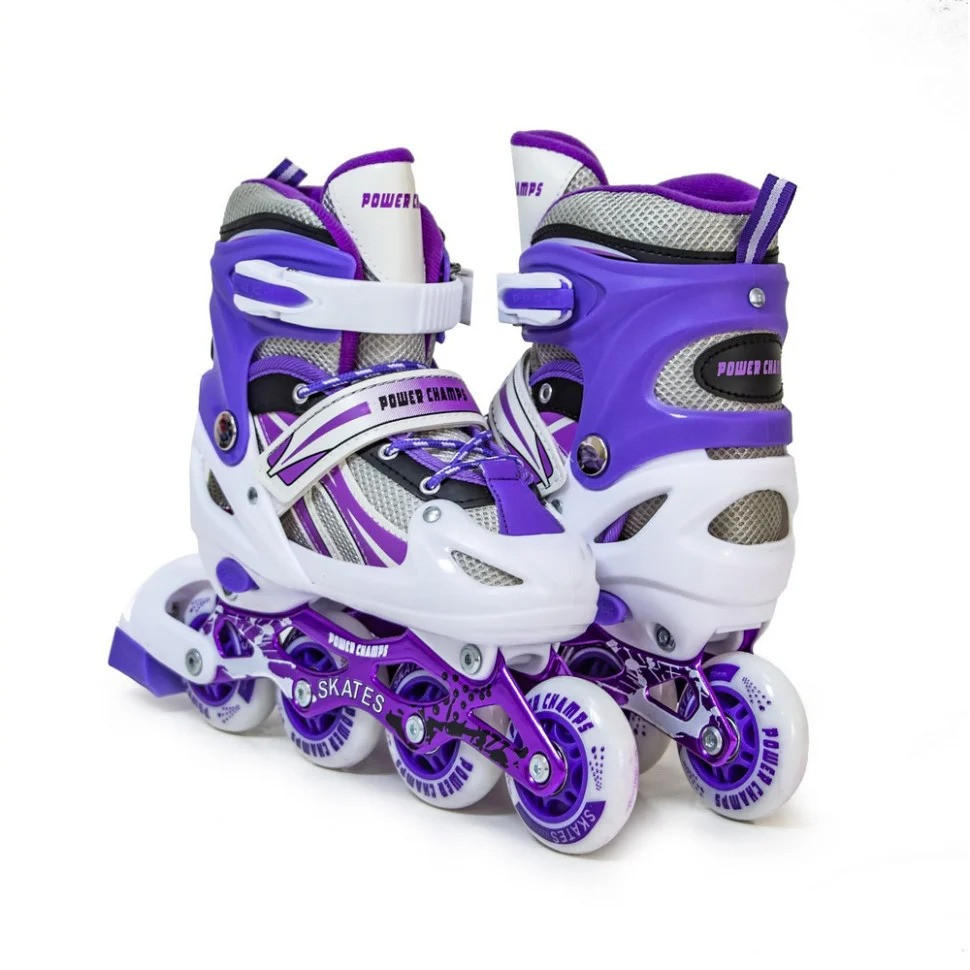 Опис і переваги роликів "Power Champs" :виріб торгової марки "Power Champs";економічність використання за рахунок кнопкової системи регулювання на 4 повних розміри;надійність і безпека - завдяки шнурівці;кріплення на кліпсу AUTОLOCK і п'ятковий ремінь;м'який матеріал черевика (присутність жорстких елементів для правильності стопи) - зручність і здоров'я;сітчастий матеріал в основі черевика - вентиляція;широка устілка - зручне катання навіть під час тривалих прогулянок;присутність гальма - додаткова безпека;рама з алюмінію, фірмові підшипники ABEC-7;міцні колеса 64*24 мм з поліпропілену (рівень жорсткості 80А);можливі розміри виробу: від 29 до 33, від 34 до37;забарвлення: фіолетовий з білим.