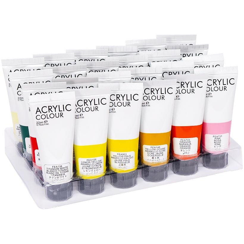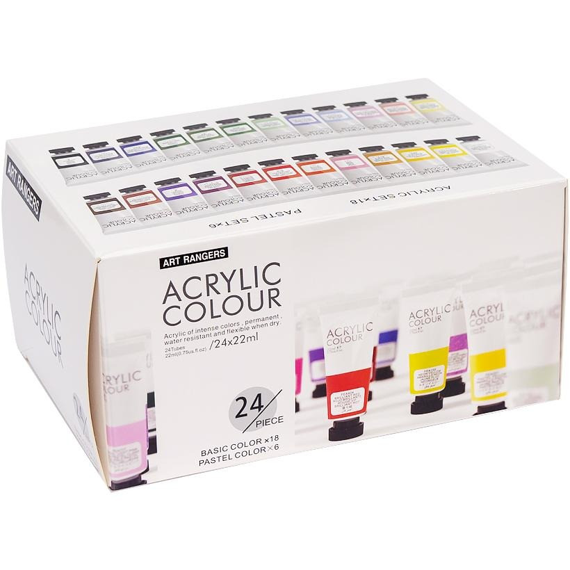 Набір акрилових фарб "Art Ranger" включає 24 туби фарб на водній основі по 22 мл кожна. Фарби насичені, стійкі, мають хорошу покриваність і легко змішуються для створення нових відтінків. Вони підходять для нанесення на різні поверхні, включаючи папір, полотно, дерево, метал, камінь і штукатурку. Фарби упаковані в картонну коробку розміром 13,5 × 10 × 13 см.