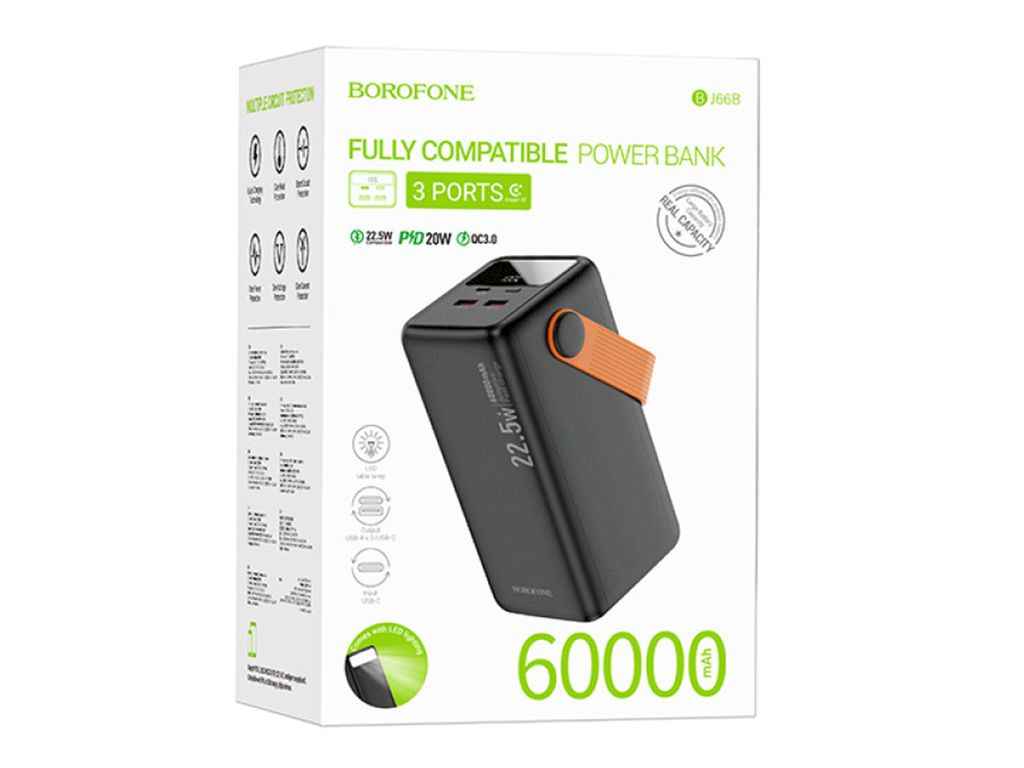 Power Bank 60000mAh BJ66B 2USB/QC3.0/22.5W/PD20W/LED дисплей/ліхтарик (input Type-C 18W) чорний ТМ BOROFONE