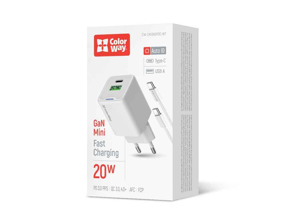 Імя: Мережевий зарядний пристрій ColorWay GaN Mini 20W PD Port PPS USB (Type-C PD USB QC4.0) cable Type-C (CW-CHS062PDC-WT)