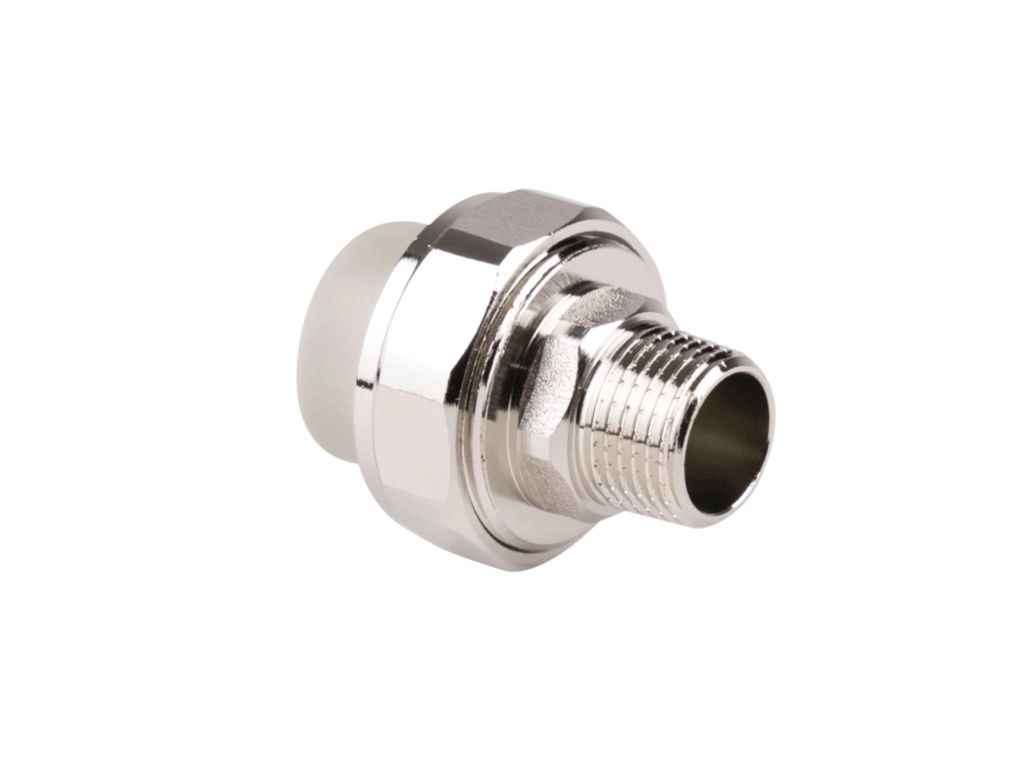 Опис: При потребі виконати різьбове зєднання, під’єднати різні сантехнічні та теплотехнічні приладами до поліпропіленового відрізку трубопроводу використовують перехідні муфти з латуні й ППР. Один з варіантів такого фітингу — Американка PPR Thermo Alliance 20х1/2 ЗР. Умовний прохід дорівнює 20 мм, різьба зовнішня, її розмір 1/2 дюйма. Конструкція виробу складається з двох штуцерів, гайки та прокладки для герметизації.