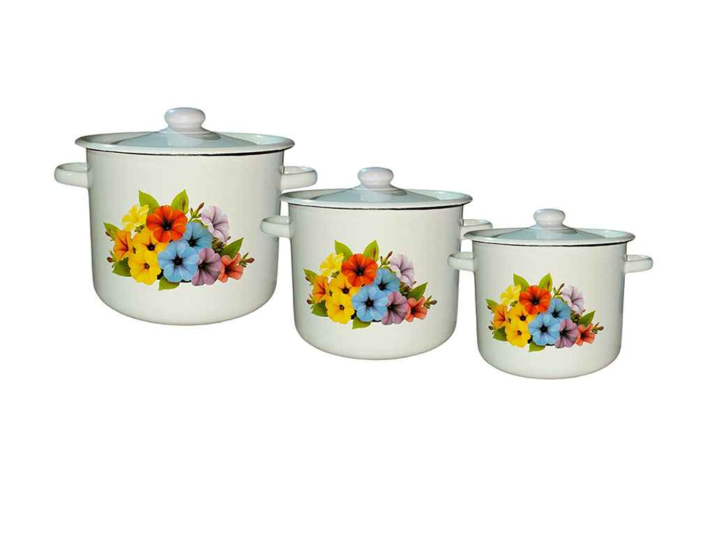 Каструля циліндрична 2,0 л-1шт, Каструля циліндрична 3,0 л-1шт, Каструля циліндрична 4,5л- 1шт. Підходить для всіх видів плит. Емальований посуд може використовуватися для приготування і зберігання будь-яких страв, на всіх видах плит (звичайних газових, керамічних, електричних і індукційних).