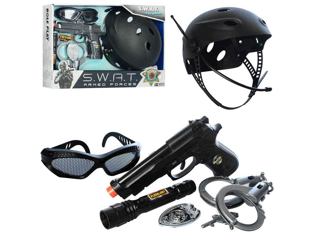 пістолет, каска, наручники, ліхтарик, окуляри