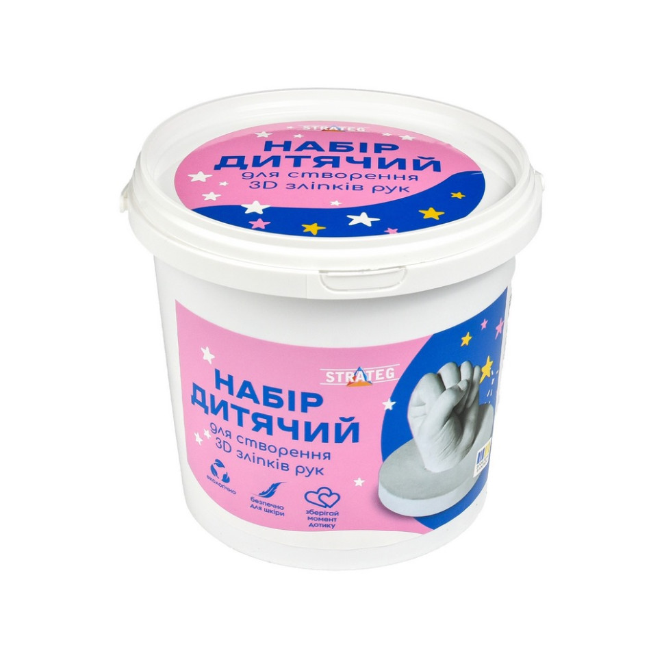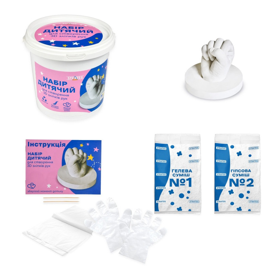 Набір дитячий для створення 3D зліпків рукМаленька ручка, яка так швидко росте. Цей набір допоможе зберегти зворушливий момент — перший дотик та тепло дитячої долоньки. Ідеальний подарунок для молодих батьків, хрещених або як пам'ятка про перші роки життя.♦ Комплектація: відерце-упаковка (виготовлена з пластику), гіпс, гелева суміш, дерев'яні зубочистки - 2 шт., одноразові рукавиці - 1 пара (виготовлені з поліетилену), інструкція (виготовлена з паперу), скатертина - 1 шт.