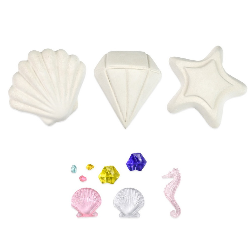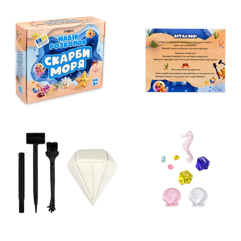 Набір для творчості «Скарби моря» - це цікава та захоплива розвага для допитливих дітей віком від 5 років. В комплекті - гіпсова фігурка з сюрпризом усередині, який дитина може відшукати за допомогою спеціальних інструментів.Комплектація: коробка (виготовлена з картону), гіпсова фігура (виготовлена з гіпсу), набір інструментів (виготовлені з пластику), інструкція (виготовлена з паперу).