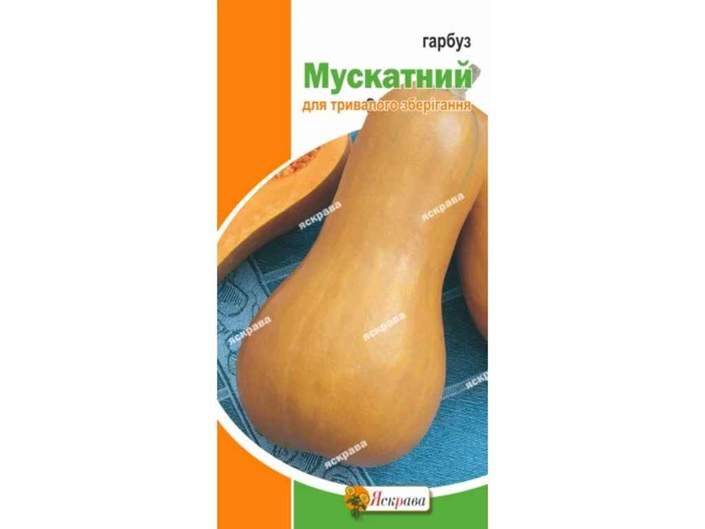 Мускатний гарбуз невеликого розміру і витягнутої форми відрізняється дуже соковитою жовто-оранжевою мякоттю і ніжною кремовою шкірою, що видно на фото. Аромат і смак гарбуза насичений, солодкий, розкривається при термічній обробці. Сорт ранньостиглий - від 95 до 110 днів з моменту появи сходів, вага гарбуза - 2-4 кг,придатний для вирощування у відкритому ґрунті,посадку насіння проводять у відкритий ґрунт у кінці травня,наприкінці серпня збирають урожай.