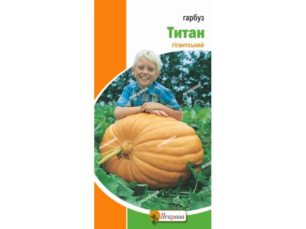 Гарбуз Титан повністю відповідає своїй назві й може досягати у вазі до 60 кг, а в діаметрі бути більше 1 м. Його мякоть містить величезну кількість вітамінів, включаючи бета-каротин і групу В, а також інші необхідні мікроелементи для організму.Сорт пізньостиглий - до збору плодів проходить 120-125 днів,сорт до розтріскування не схильний,насіння висівають у кінці квітня або в травні,урожай збирають у серпні-вересні.Сорт стійкий до посухи і захворювань