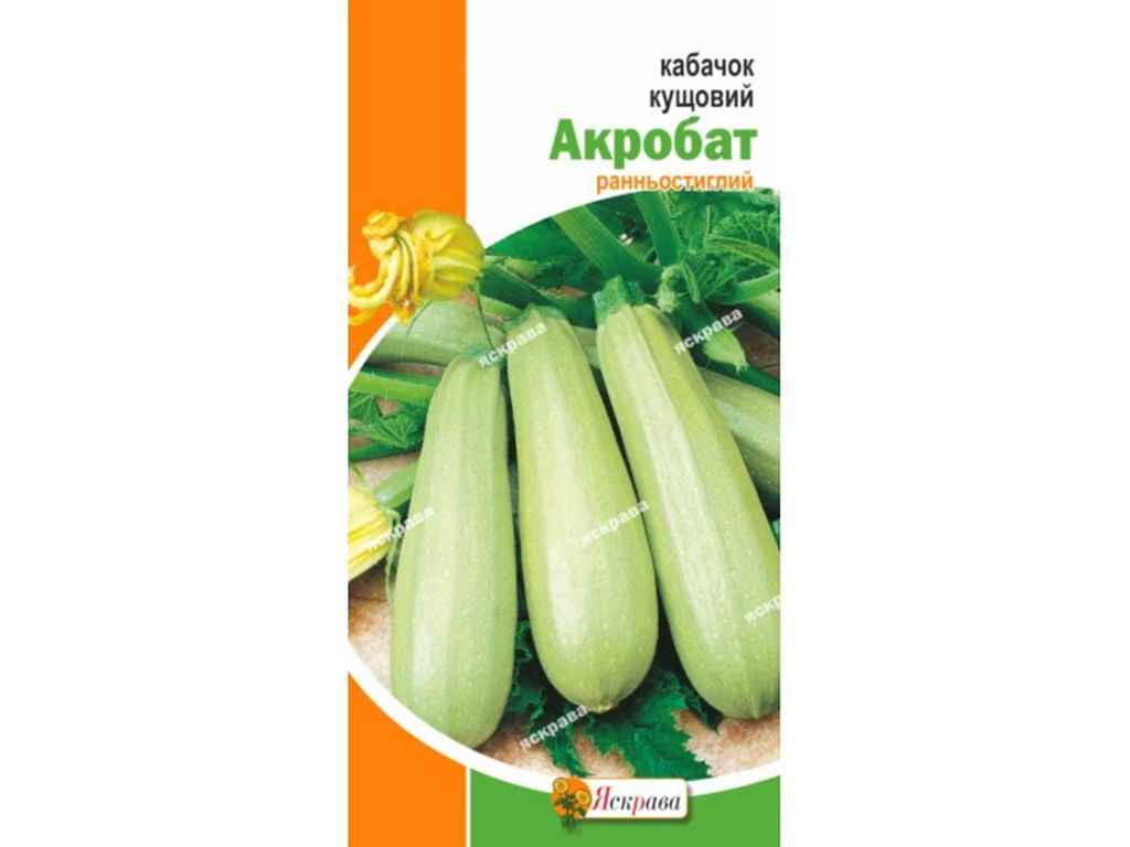 Кущовий кабачок Акробат - ранньостиглий сорт, невибагливий у вирощуванні, має гарну врожайність. Плоди середні, майже одного розміру, з тонкою шкіркою.