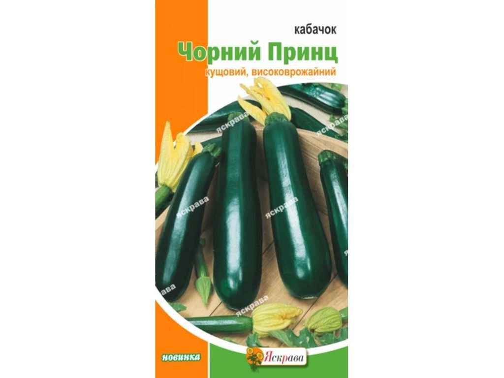 Кабачок Чорний принц – один з кращих сортів для домашнього вирощування. Насіння кабачка цього сорту користується популярністю у садівників – рослина дуже урожайна зі смачними та корисними плодами. Навіть початківець на дачі зможе забезпечити свою сімю свіжими кабачками для щоденної кулінарії, а також всіх видів консервування, приготування ікри «під кришечку» та інших зимових заготовок.Насіння кабачків раннього терміну достигання,вегетаційний період – 40-43 діб від сходів до перших плодів,плоди – темно-зеленого (майже чорного) кольору, циліндричної форми з гладенькою поверхнею,маса – 0,8-1,5 кг.Терміни посадки у відкритий грунт – травень/червень,збір врожаю – липень/серпень.