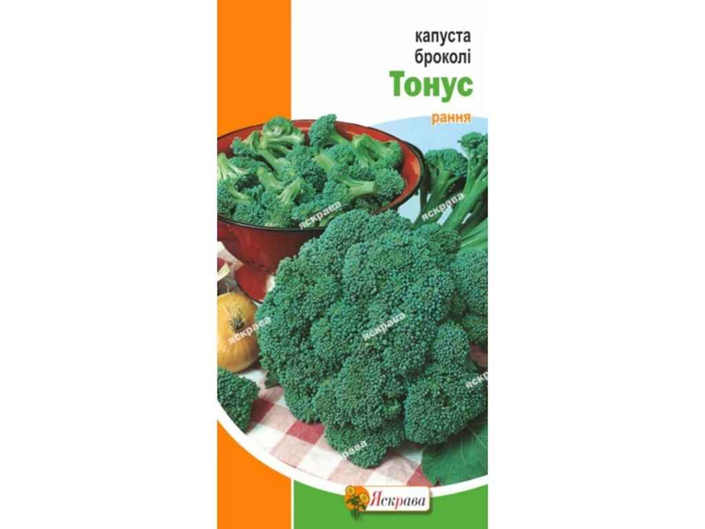 Капуста броколі Тонус з ніжними пишними суцвіттями насиченого зеленого кольору містить величезну кількість необхідних для людини вітамінів і мікроелементів.Період до повної зрілості становить 80-90 днів, забарвлення зелене, вага до 300 г,посів насіння на розсаду починають у березні,до кінця травня пересаджують у ґрунт,капуста не любить застою води і органічних добрив,до захворювань не схильна.