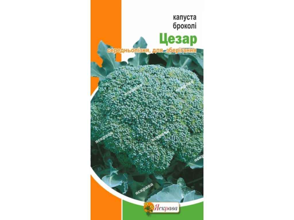 Середньостигла капуста броколі Цезар відмінно підходить для вживання у свіжому і приготованому вигляді. Її хрусткі суцвіття мають мякий і ніжний смак, гарні як сольно, так і в поєднанні з іншими овочами.Період дозрівання пізній - до 80-85 днів,качани щільні, великі,врожайність досягає 2,5-3,5 кг/м.Посів насіння на розсаду - у березні, пересадка в ґрунт - у травні.