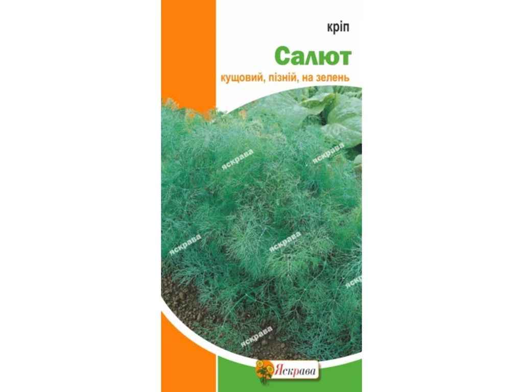 Кріп Салют 5 г — традиційний сорт. Свою назву він отримає завдяки сильній гіллястості та красивій піднятій розетці листя. Його кількість сягає 30 штук на одній рослині, загальною масою 100-200 г. Приємна особливість Салюту в тому, що він довго не зацвітає, що подовжує період врожайності зелені. За сезон можна зрізати її до 3-4 разів, адже вона швидко відростає знову.Кущ потужний, висотою до 100 см, з пірястим листям, до 16 см завдовжки,врожайність (при сприятливих умовах) —5 кг з 1 м.кв.