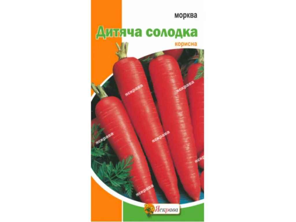 Солодкий сорт моркви Дитяча солодка популярний як серед фермерів, так і серед домогосподарок і молодих матусь.Сорт середньоранній,дозрівання відбувається вже на 100-120 день від сходів,середня маса морквини 100-150 г, з 1 кв. м можна зібрати до 5-8 кг,витримує низькі температури до - 4 °C. Терміни посадки моркви у відкритий ґрунт насінням: у квітні та у червні.