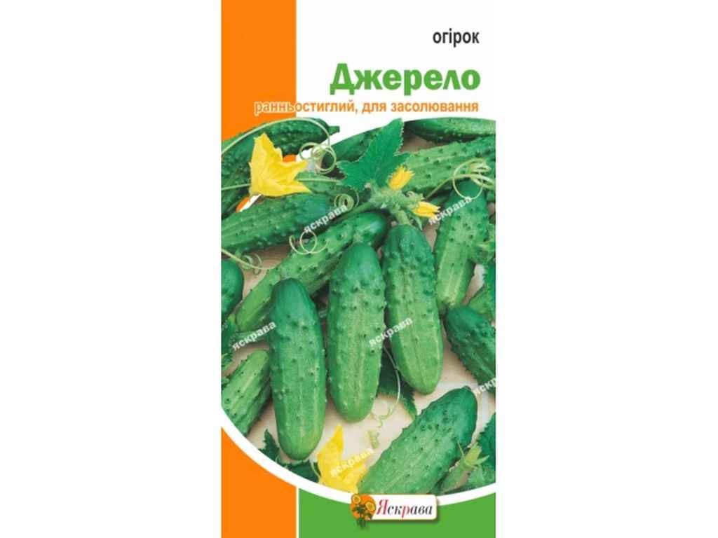 Ранньостиглий дуже ніжний огірок Джерело відомий своїми високими врожаями.Період дозрівання 38-40 днів,зеленці виростають до 11 см,середня вага близько 100 г. Місце для посадки підійде сонячне і безвітряне недалеко від квітучих рослин. Перед посівом ґрунт удобрюють і перекопують, а насіння знезаражують і вимочують добу у воді. Після того, як вони проклюнулися, їх висівають на глибину 1-2 см і присипають деревною золою. Сходи зявляються протягом 4-5 днів і активно йдуть у зростання.