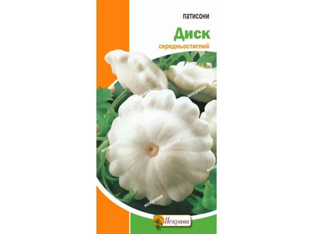 Патисон Білий диск 2 г - давно полюбився українському споживачеві завдяки цікавому присмаку спаржі і грибів.Кущ компактний, утворює 1-2 пагони,урожай збирають із липня по серпень, до 6,4 кг з 1 м. кв.Не виносить заморозків.