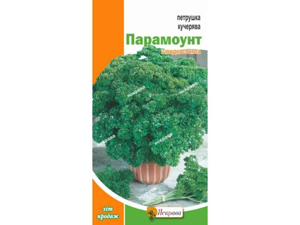 Кучерява петрушка Парамоунт - невисока пряна рослина з гарним листям і яскравим ароматом.Період дозрівання 60-65 днів,листя різьблене, дуже закручене,висота рослини до 30 см, сорт холодо- і посухостійкий,підходить для цілорічного вирощування в теплицях і в сезон - у відкритому ґрунті,висадку починають у першій половині весни.До захворювань схильностей немає.