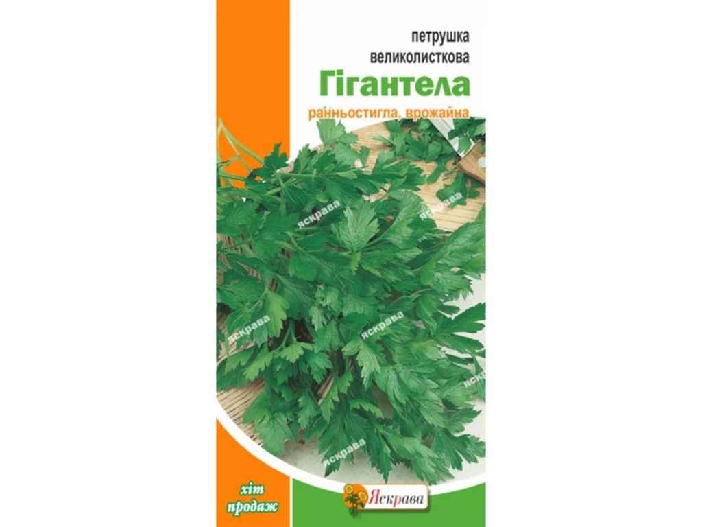 Гігантелла - це петрушка з великими різьбленими листям, що відрізняється ніжним ароматом.Дозріває швидко - протягом 60-70 днів,за сезон збирають до 5 врожаїв зелені,насіння висівають у першій половині квітня у відкритий ґрунт.Сорт морозостійкий, заморозків не боїться.