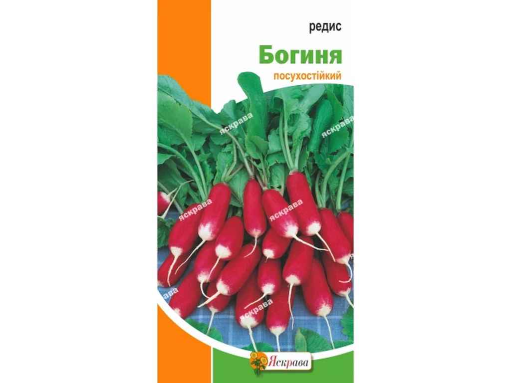 Ефектний редис Богиня виправдовує свою назву. Його подовжені коренеплоди пофарбовані в пурпурний і білий кольори, відрізняються ніжним і трохи терпким смаком без грама гіркоти.Дозрівання раннє - 20-25 днів,не боїться холодів і посухи,Посів насіння редису починається в першій половині весни, для теплиць посадку починають у березні, а для відкритого ґрунту - у першій половині квітня.