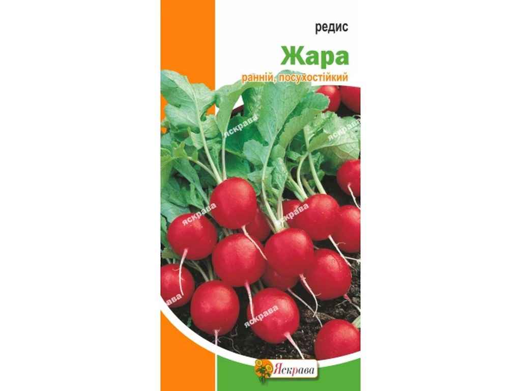 Гарний круглий редис Жара з яскраво-червоними солодко-гострими коренеплодами вважається одним з найпопулярніших сортів як серед садівників, так і серед кулінарів.Сорт ранній, дозріває протягом 18-23 днів,форма коренеплодів кругла, вага до 25-30 г,посів з квітня,не боїться холодів і посухи.Стійкість до захворювань висока.