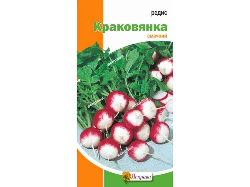 Краковянка - це популярний в Україні редис класичного забарвлення (червоного з білим) і дуже ніжного смаку.Сорт дозріває швидко - за 23-25 днів,середня вага редису до 22 г,сорт до гіркоти не схильний,вирощується до початку осені,посів насіння з квітня до серпня раз на 10-14 днів.