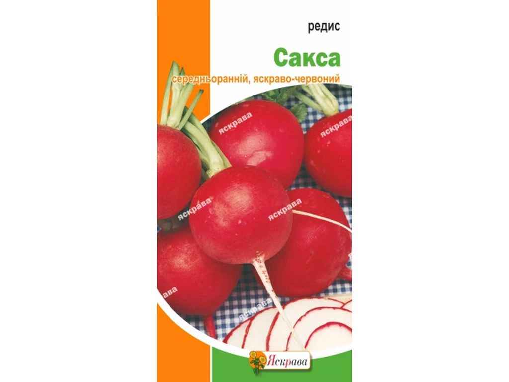 Гарний малиновий редис Сакса з яскравим смаком відрізняється помірною гостротою і хорошою хрусткістю.Період дозрівання середньоранній - до 25 днів,не боїться холодів і захворювань,Вибирайте для насіння редису легкі і дреновані ґрунти, освітлені сонцем місця і мінеральні добрива. Перед посадкою перекопайте ґрунт, додайте підживлення, пролийте водою. Насіння обробіть знезаражувальним розчином, залийте водою на добу. За цей час вони проклюнуться, і їх можна висаджувати в ґрунт. Глибина посадки не повинна перевищувати 2 см, відстань між рядами має бути близько 20 см. Сходи зявляються протягом 5 днів, особливого догляду не вимагають, тільки полив і розпушування.