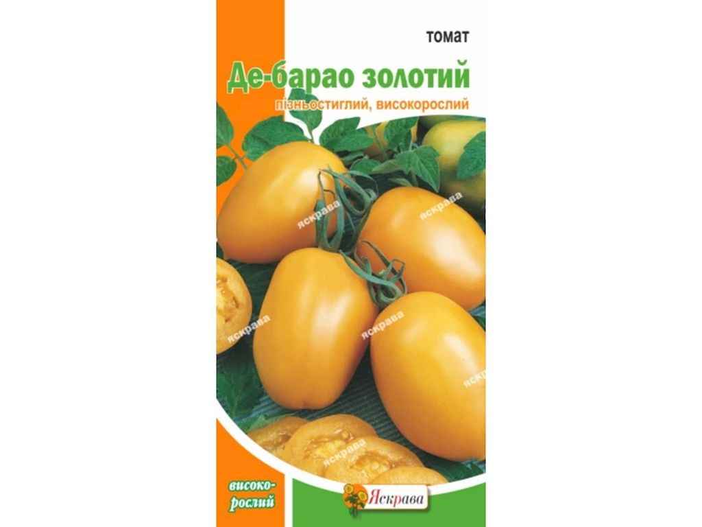 Жовтий іноземець, томат Де-Барао золотий, давно полюбився дачникам нашого регіону завдяки відмінному смаку і кількості врожаю. Кущ високий, розлогий до 2 м, обовязково потрібна опора,плоди мають максимальну масу до 90 г,середньостиглий сорт, з моменту посадки до дозрівання проходить до 120 днів.Кількість врожаю з одного куща більше 8 кг.Посів насіння томатів починають в березні в поживний ґрунти.