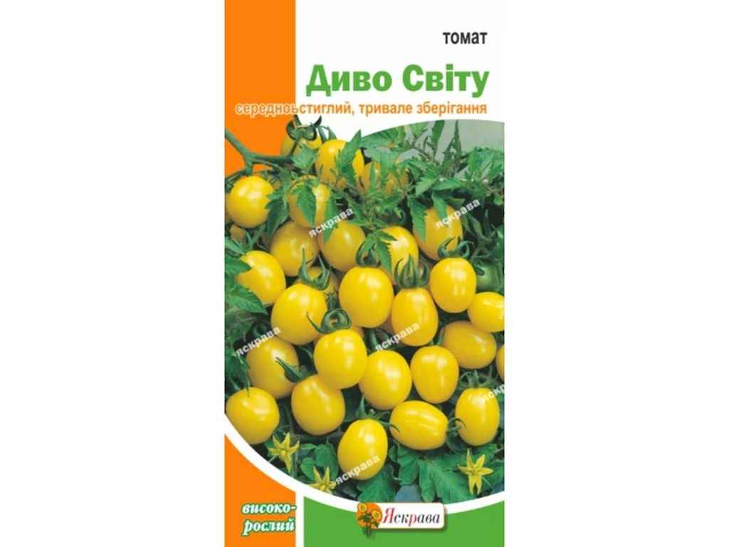 Лимонний томат Диво Світу повністю виправдовує свою назву. Надзвичайно смачні плоди з незвичайним забарвленням і зовнішнім виглядом давно отримали визнання в усьому світі.Сорт індетермінантний, зростом до 2 м, вага помідора до 120 г,період дозрівання середній - 110-120 днів.Щоб висадити його за всіма правилами, попередньо замочіть їх у воді й обробіть епіном. Вибирайте живильний торфяної субстрат, рясно змочіть його і заглибте насіння на 1-2 см.