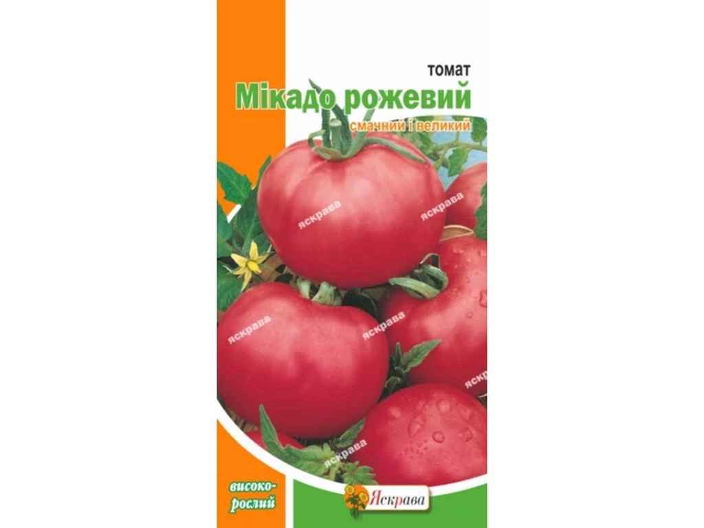 Томат Мікадо рожевий середньоранній сорт.Кущ рослої висоти, до 190 см,плоди досягають в середньому вагу до 400 г, в окремих випадках вага плодів, які ростуть на нижніх гілках може бути до 800 г,плодоношення зрілого врожаю припадає на 110 день після сходів.На початку березня починається посів насіння томату для розсади.